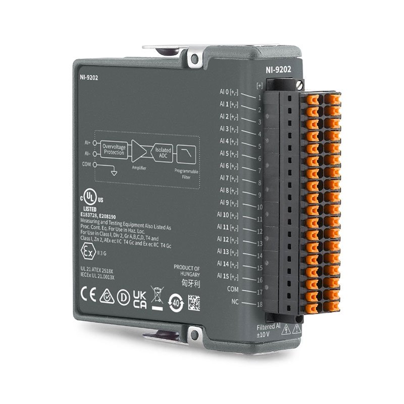 The NI-9202 has excellent flexibility to meet the needs of your applications. The module has 16 simultaneous sampling, differential input channels to create large, distributed systems in a rugged form factor. It also has configurable filters to eliminate noise in your system while maintaining low-latency to be used in control systems.