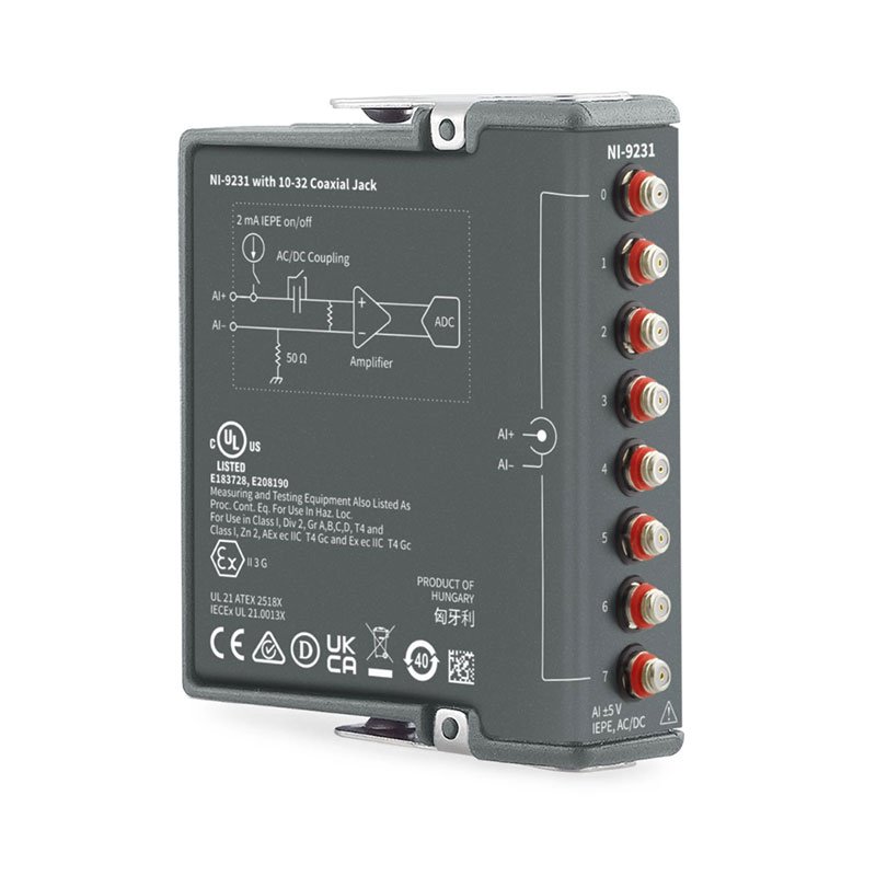 The NI-9231 is a high-density sound and vibration module that can measure signals from integrated electronic piezoelectric (IEPE) and non-IEPE sensors such as accelerometers, tachometers, and proximity probes. It can perform the high dynamic range measurements necessary for modern measurement microphones and accelerometers and features simultaneous sampling. The NI-9231 incorporates both a TEDS input path and 2 mA of IEPE signal excitation source that can be turned on and off, removing the need for external sensor power and reducing the complexity of the data acquisition system.