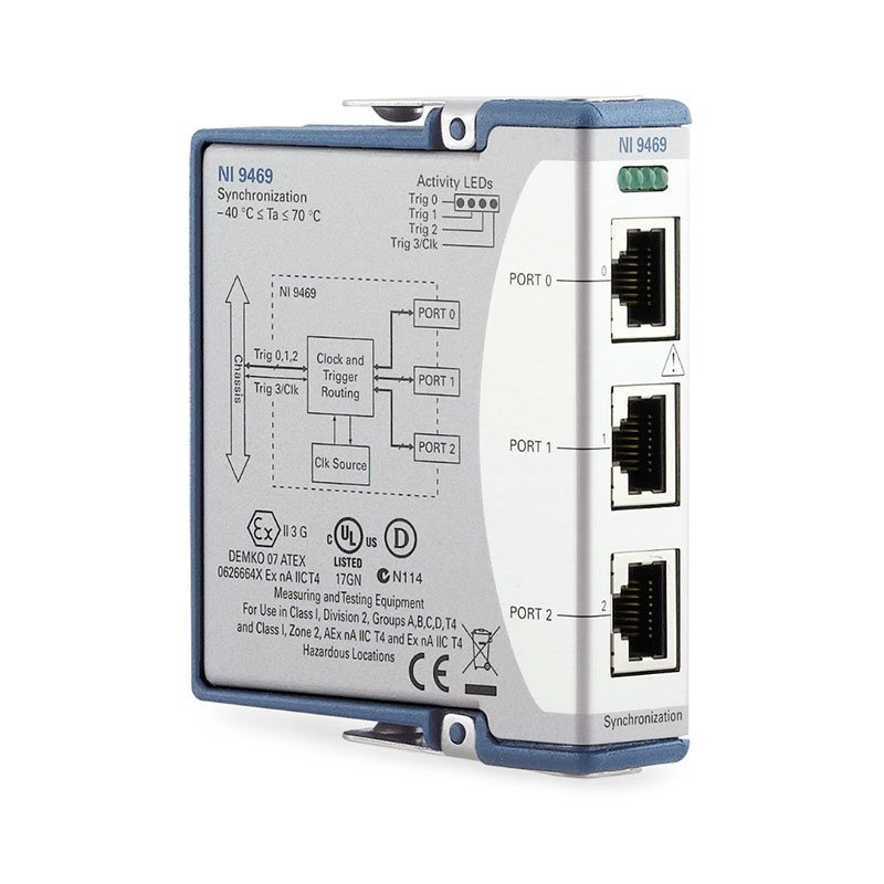 The NI‑9469 is a cabled module you can use to route clocks and triggers between multiple chassis. The NI‑DAQmx and NI‑RIO drivers are shipped with default master/slave configurations for quick synchronization applications, but you can also customize the routing of the trigger and clock lines between the inports, outports, and chassis to create large-scale systems with custom timing and triggering. The NI‑9469 was designed to synchronize modules with simultaneous delta‑sigma A/D converters for high‑channel‑count systems that require more than one chassis. In addition to delta‑sigma synchronization, you can program the four input lines and eight output lines (four per port) of the NI‑9469 for custom trigger schemes.