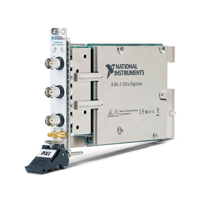 The PXI‑5153 high-speed PXI oscilloscope has two channels with flexible settings for coupling, voltage range, and filtering. PXI oscilloscopes also feature a number of triggering modes, deep onboard memory, and an instrument driver that includes data streaming and analysis functions. This device is ideal for applications with fast signals that require up to 50 MHz of analog bandwidth and flexible measurement configurations. The PXI‑5153 also features PXI synchronization and data streaming capabilities.