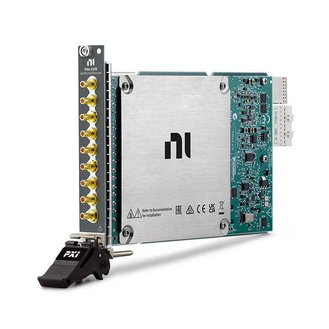 The PXIe‑5105 high-density PXI oscilloscope has eight simultaneously-sampled channels with flexible settings for coupling, impedance, voltage range, and filtering. PXI oscilloscopes also feature a number of triggering modes, deep onboard memory, and an instrument driver that includes data streaming and analysis functions. This device is ideal for applications with many channels that require up to 60 MS/s or 60 MHz of analog bandwidth. The PXIe‑5105 also features advanced PXI synchronization and data streaming capabilities.