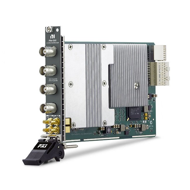 The PXIe-5162 high-speed oscilloscope device has two or four channels that sample at up to 5 GS/s with flexible settings for coupling, voltage range, and filtering. PXI Oscilloscopes also feature a number of triggering modes, deep onboard memory, and an instrument driver that includes data streaming and analysis functions. This device is ideal for applications with fast signals that require up to 1.5 GHz of analog bandwidth and flexible measurement configurations. The PXIe-5162 also features a high-precision triggering circuit as well as PXI synchronization and data streaming capabilities. Some options also support CableSense™ technology, which can detect and locate signal path faults, changes, or discontinuities.
