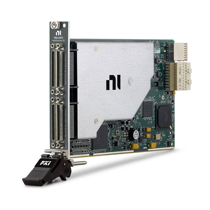 The PXIe‑6375 offers analog I/O, digital I/O, and four 32‑bit counter/timers for PWM, encoder, frequency, event counting, and more. The device delivers high-performance functionality leveraging the high-throughput PCI Express bus and multicore-optimized driver and application software. Onboard NI‑STC3 timing and synchronization technology delivers advanced timing functionality, including independent analog and digital timing engines and retriggerable measurement tasks. The PXIe‑6375 is well-suited for a broad range of applications, from basic data logging to control and test automation. The included NI‑DAQmx driver and configuration utility simplify configuration and measurements.