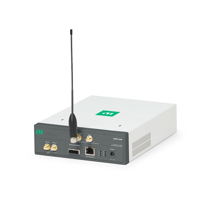 The USRP‑2930 is a tunable RF transceiver with a high-speed analog‑to‑digital converter and digital‑to‑analog converter for streaming baseband I and Q signals to a host PC over 1 Gigabit Ethernet. It also features a GPS-disciplined oscillator (GPSDO) with PPS accuracy of ±50 ns. You also can use the NI USRP‑2930 for the following communications applications: white space; broadcast FM; public safety; land-mobile, low-power unlicensed devices on industrial, scientific, and medical (ISM) bands; sensor networks; cell phone; amateur radio; or GPS.
